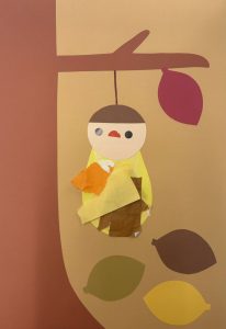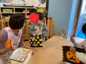 きりんぐみ(2歳児さん)で、ハロウィンのイベントとして、自分たちで折り紙で作ったペロペロキャンディやビスケットをもらいにテーブルを渡り歩き、